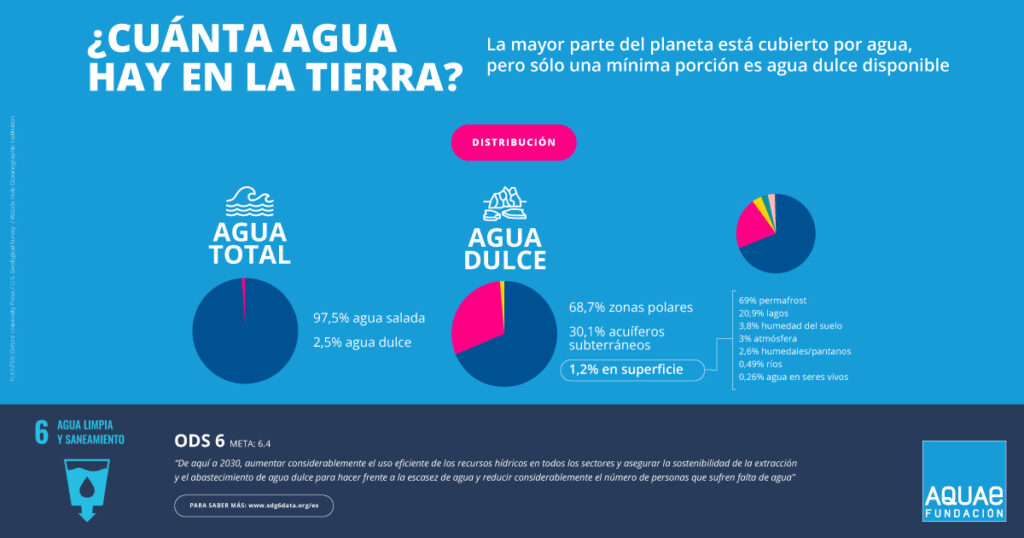 Se calcula, por tanto, que la cantidad de agua dulce que hay en la Tierra representa tan solo el 2,5% del total. Pero la mayoría de esa agua dulce no está disponible, pues la mayor parte está en forma de hielo o enterrada en el suelo.