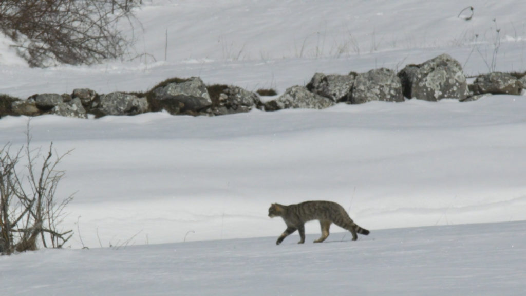 El gato montés, o Felis Silvestris, es un felino muy similar al lince ibérico, hasta el punto de ser difícil su distinción. Posee un pelaje gris atigrado y una larga cola con punta redonda. Es una especie de felinos que se muestra muy activo tras la puesta de sol, desde el mismo instante en el que comienza a anochecer. Sin embargo, durante el invierno, se adapta a los horarios de sus presas convirtiéndose en un animal diurno. Llegado el caso puede recorrer hasta 20 kilómetros en una noche en busca de alimento.