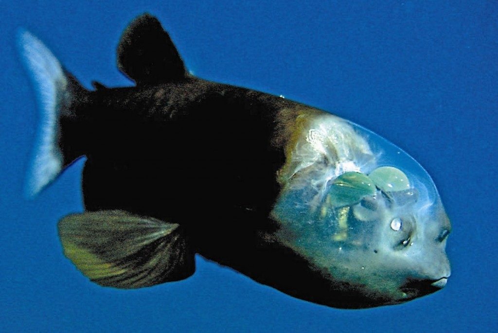 Debido a su forma tan peculiar, es también conocido como “pez cabeza”. La cabeza del pez duende tiene la forma de un domo transparente debido a que está llena de un líquido incoloro. Esta sustancia permite, desde determinada distancia, observar sin problema su parte interna. Así, los ojos, cerebro y sistema nervioso que componen esa zona de su cuerpo son visibles.